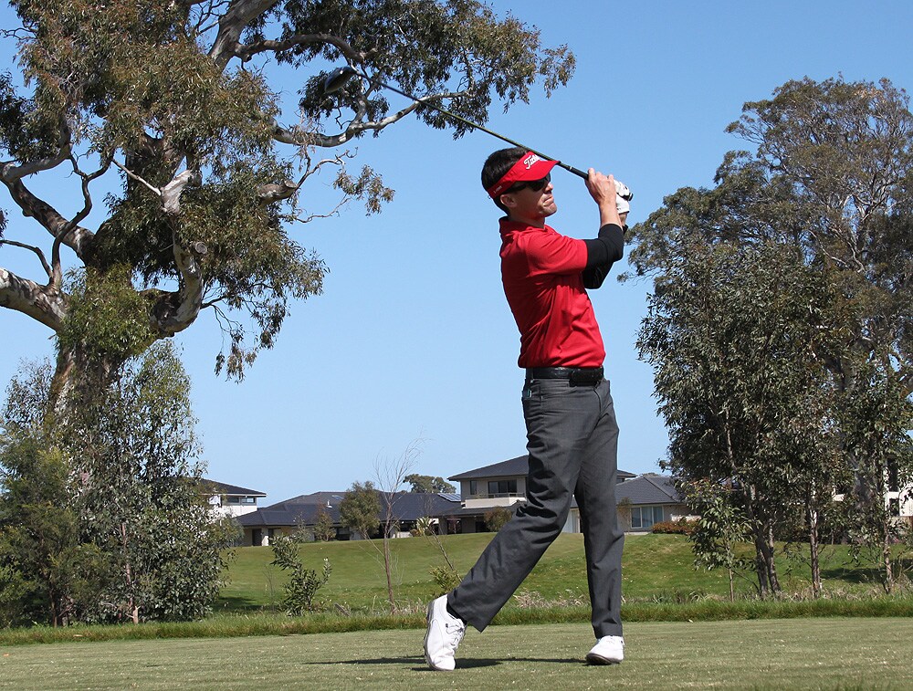 Titleist Staff Professional Sam Howe from Bonnie Doon Golf Club in NSW tees off on the 9th hole Thursday.