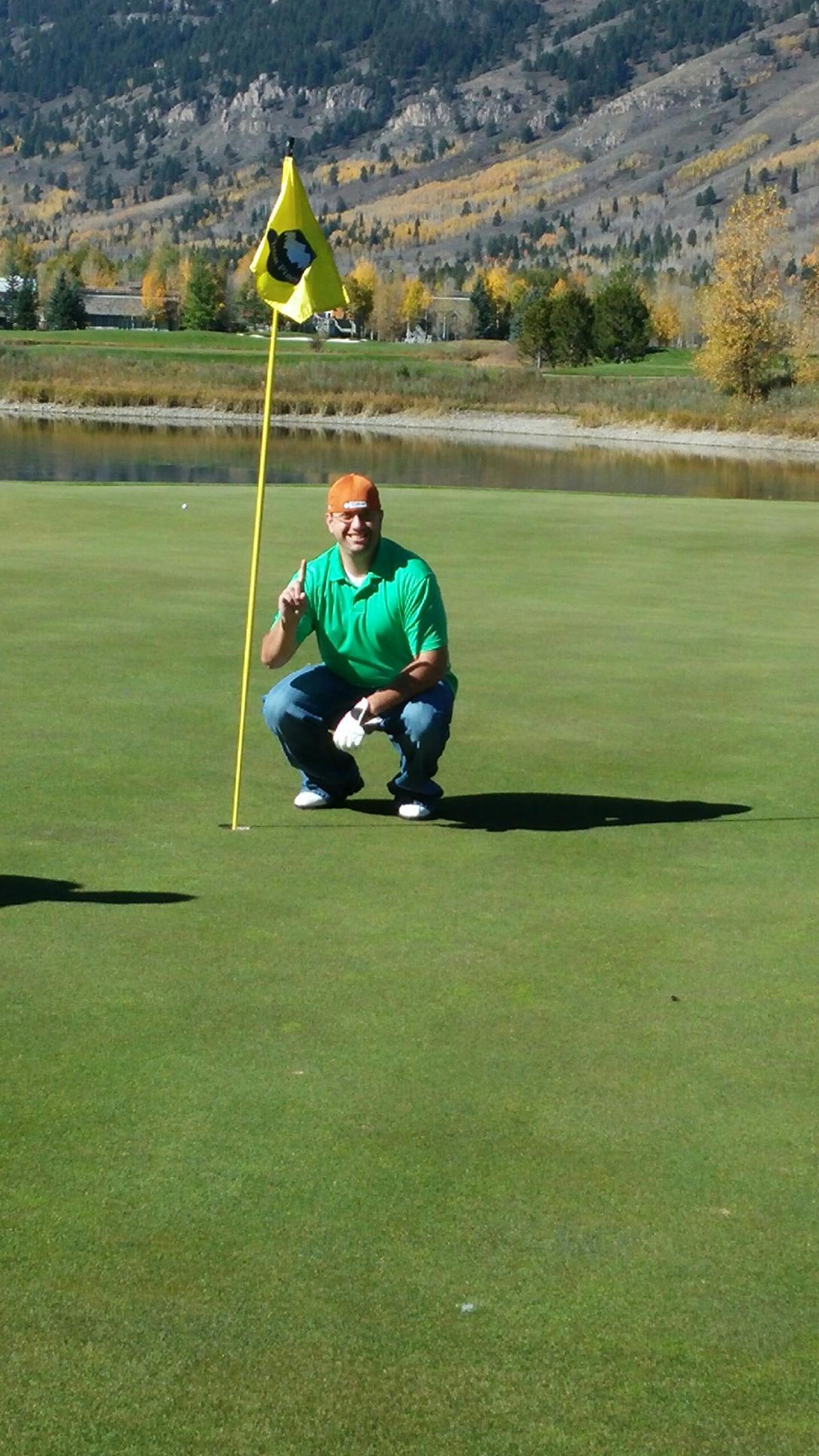 Great Fall day for golf in Wyoming! We go and play Teton Pines Country Club every fall in Jackson Hole Wyoming. This year was no different. The first round on hole 3 a 166 par 3 I nailed my first hole in one! I have played competitive golf on IJGA, Madison Golf Team etc since I was 12 years old. I have played thousands of rounds of golf and never had a hole in one. I am now 32 and finally had my first one.. The hole was a 166 yard par 3 with a large bunker in the front.. Nailed it and was heading straight for the pin.. It landed and that's all we got to see due to the bunker in the front.. We drove up and did not see a ball on the green.. I hit a 9 Iron which is my 165 club and nutted it.. So I knew it should have been on the green. The fellas I was with gave me honors to go and check the hole. I did and there was my ball.. Sittin so nicely in the cup. I screamed and all the guys screamed and hugs all around.. Of course I did buy lunch on the turn and it was amazing.. Such a fun day
