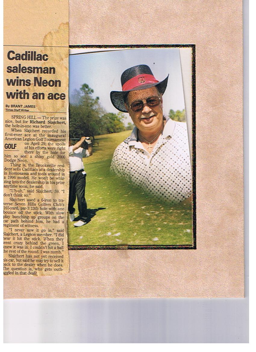 I was playing in an American Legion Tournament at Seven Hills Golf & Country Club in Springhill,Fl. At the 13th hole, a par 3, 165 Yards over a ravine I hit the most perfect shot I've ever hit. I hit a 6 Iron high with a little fade to reach the back right side. The ball took 1 bounce and dropped right in. I'm usually in the back bunker, or down the slope on the right side, so I was in total schock when the players backed up behind the green started shouting histaricaly. I did'nt see the ball go in, but when they started yelling back, IT'S IN THE HOLE I could'nt beleive it. In 50 years of playing that was my first and only, and I'll never forget it.