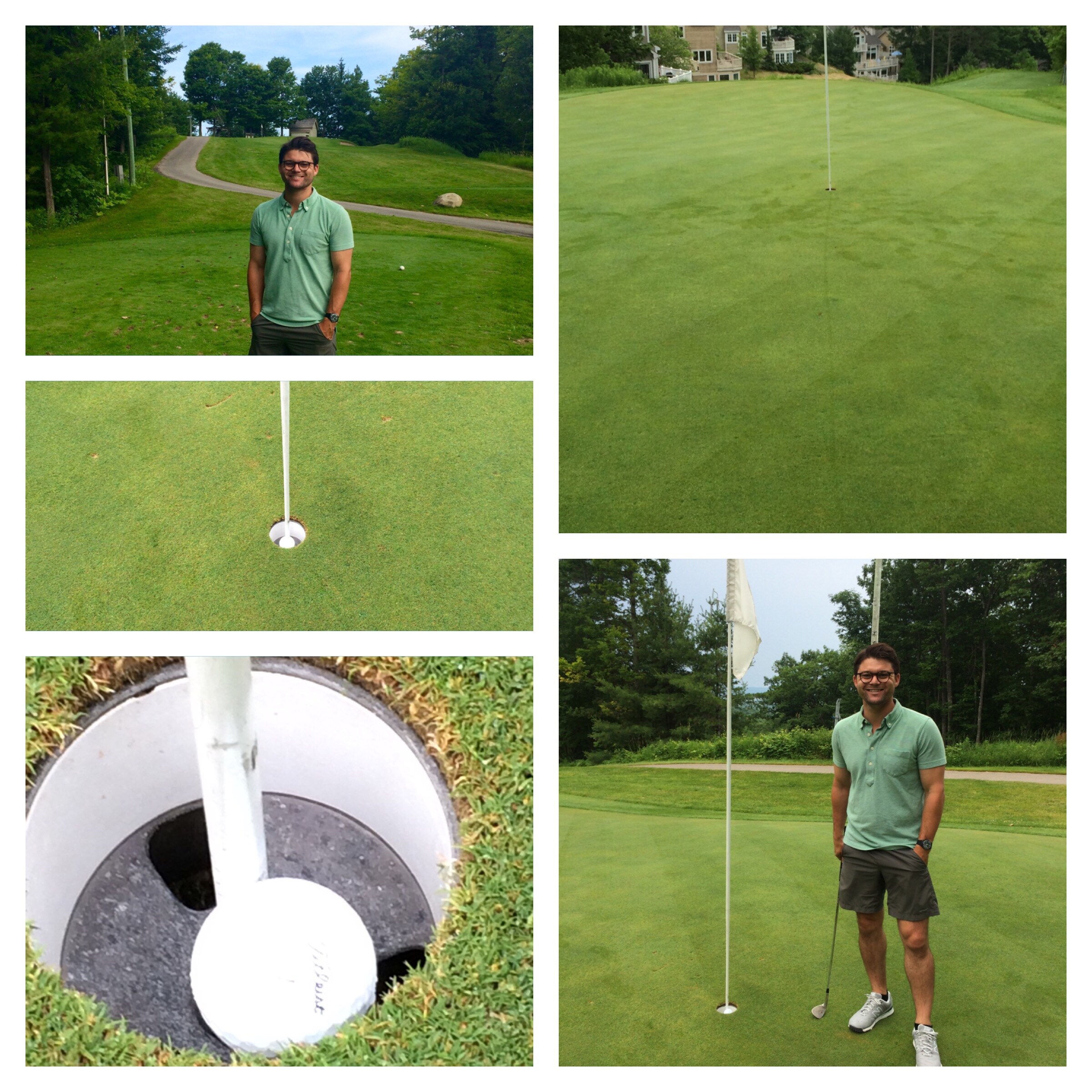 Then I look at the green and because we were the first ones on the course that day the dew was still covering the green and I see a ball mark on the backside of the green and a perfect line through the dew leading right to the cup. I look at my wife and say "Babe, Babe, look, there is no $&@#%^ way."