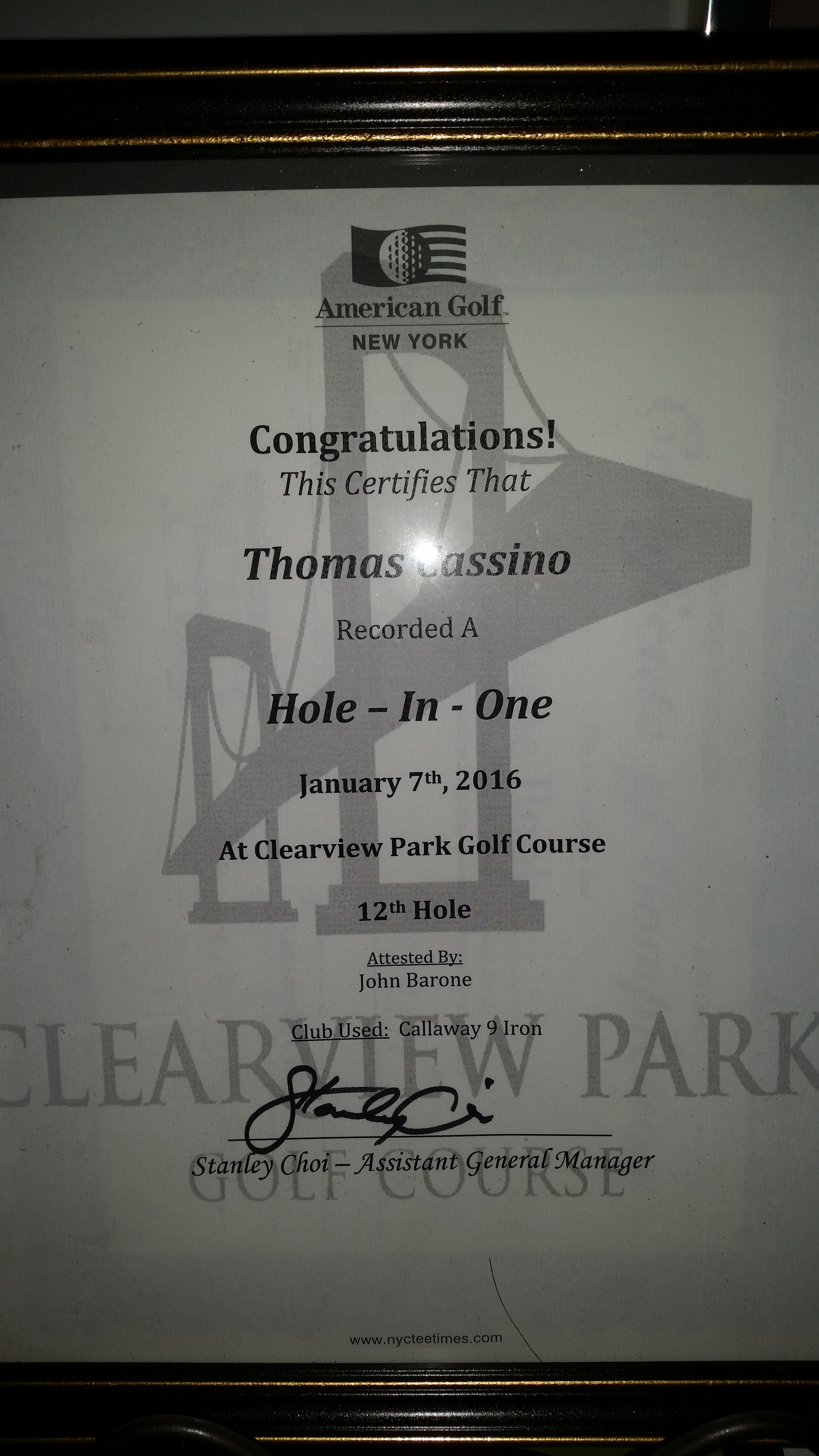 It was a cold January morning on the 12th hole at Clearview Queens Golf Course . I struck the ball with a 9 iron at the hole which was 135 yards away. Short of the green when the ball landed and bounced over the sand trap into the hole. My group of golfers and I did not see it going to the hole. We searched around the green and couldn't find the ball because it was in the hole. A hole in one.