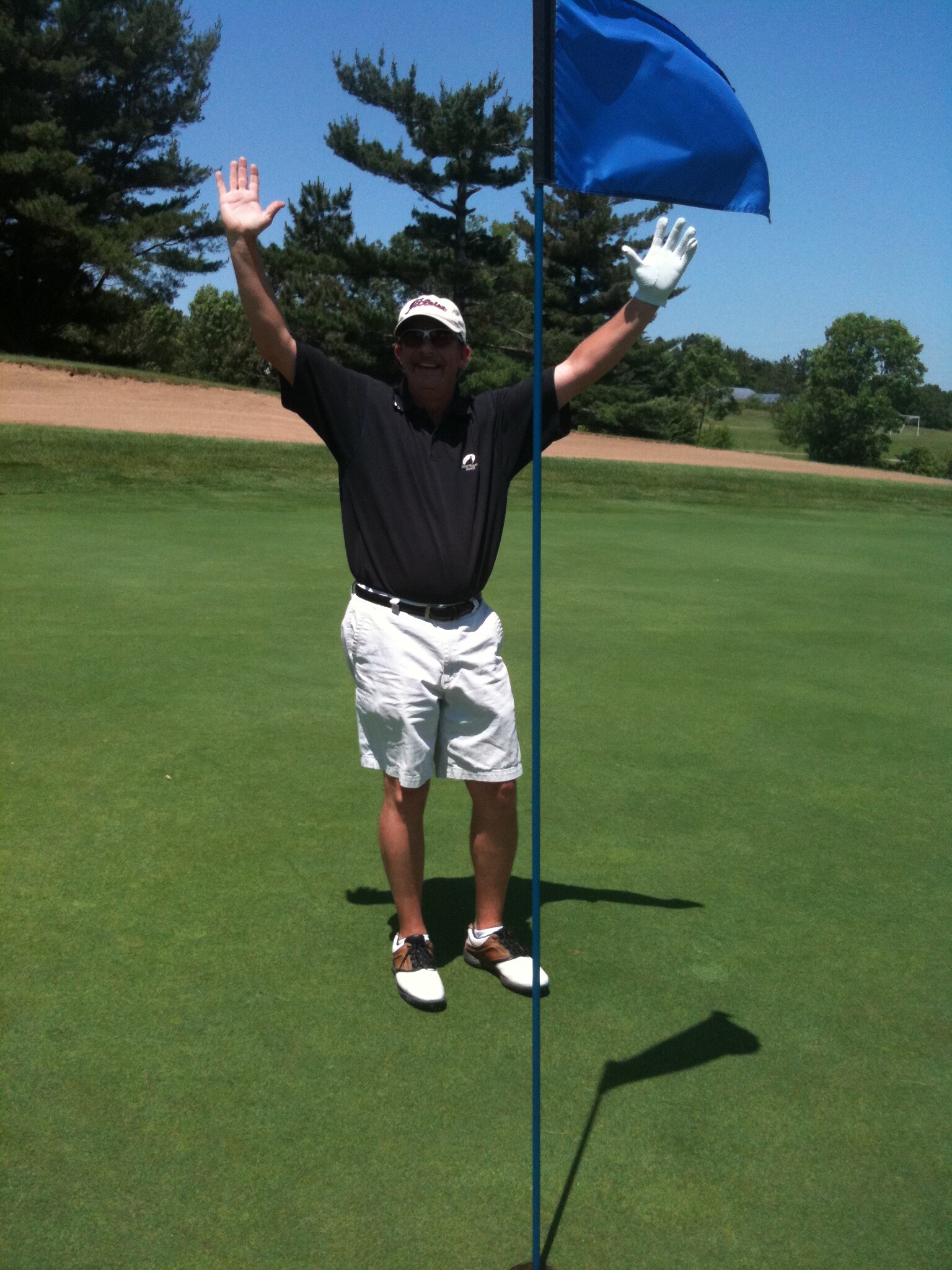 What a weekend, and invitation to see the Chicago Blackhawks win game 2 of the Stanley cup finals followed by a golf outing the next day at Elliot Golf Course in Rockford IL. Hole number 7 was playing 204 yrds with pin cut into the back. Playing with borrowed clubs from a local pro shop pro the iron was struck pure. At first we thought it rolled off the back of the green not being familiar with the hole. What excitement to walk up to the hole and see the ball in the cup. My 1st hole in one after many torn lips, bounce off flag sticks, lip outs, and stopping short. Shared with two of my closest friends and fellow golfers made it even sweeter.