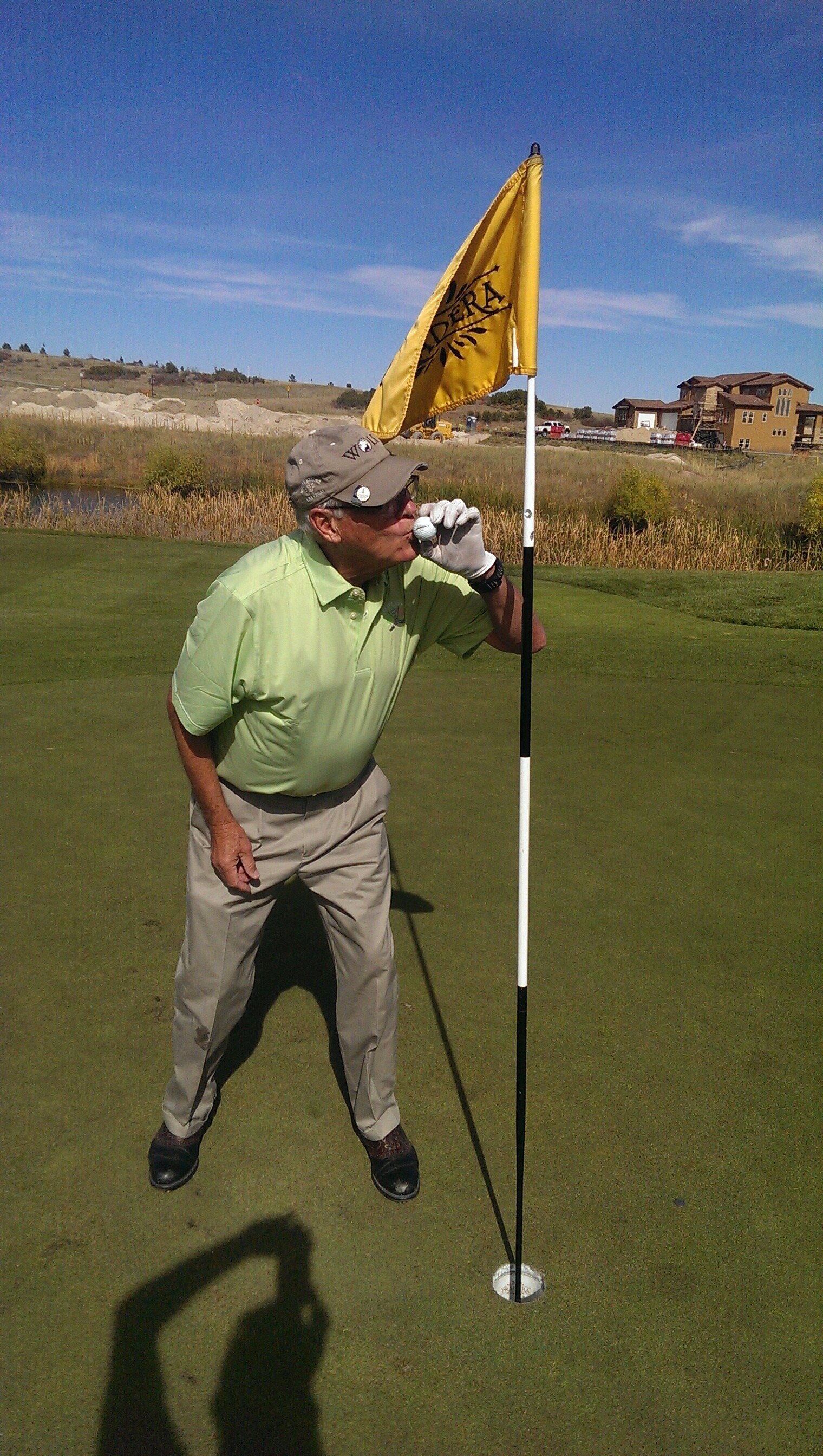 My first hole in one was fifteen years in the making. It was even sweeter because it came on the first day of the Geezer Cup at the Club at Pradera in Parker, Colorado on October 7, 2014. Earlier this year I purchased personalized Titleist ProV1 balls numbered "33" and emblazoned with "HAS ANYONE SEEN MY BALL?". That might give you the sense that I am not a low handicapper. The pin was up front. We were facing a little wind in our faces, so I clubbed up to a 6 iron and let it rip. The flight was beautiful--a subtle draw that landed a foot short of the green and curled right up into the hole. It was awesome to be in a position where we could all watch it disappear into the hole. When we arrived on the green we took a few pictures. My favorite was kissing my Titleist ProV1. Ahhh, memories....