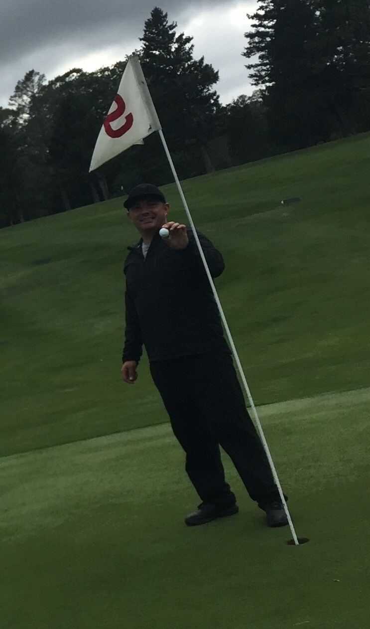Par 4 316 yards. I pull out the big stick and send it for a ride. My buddy Nolan and I get up around the green and the ball is no where to be found. As I continue to search behind and in front of the green I cannot find it anywhere. That's until Nolan looks in the cup and says you need to come here right now. Lucky it was at the bottom of the cup!