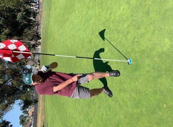 Number 18 is a downhill 217 yard par 3. Using a three iron hybrid club, I hit a solid shot high but just a little left of the green. It hit about four feet up on the tree trunk and ricocheted 90 degrees right and gently rolled into the cup. My first two holes in one were legit. We were all laughing about this one.