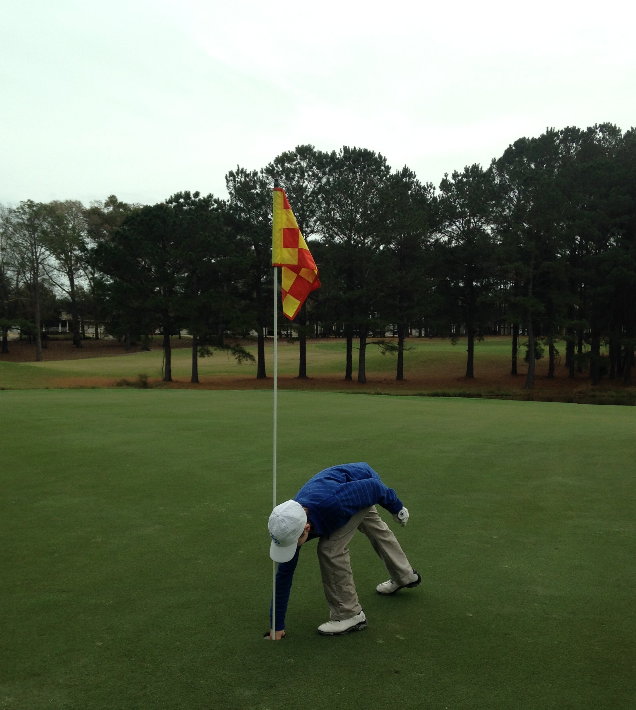 I was playing with some friends one cool December morning. I pulled the 8 iron and tried to hit it easy. It was slightly downhill and water surrounded the green. I hit it perfect. The ball landed 3 feet short and hopped in. Everyone went crazy. I immediate called my PaPa to tell him the story. This was one of the best golf moments of my life.