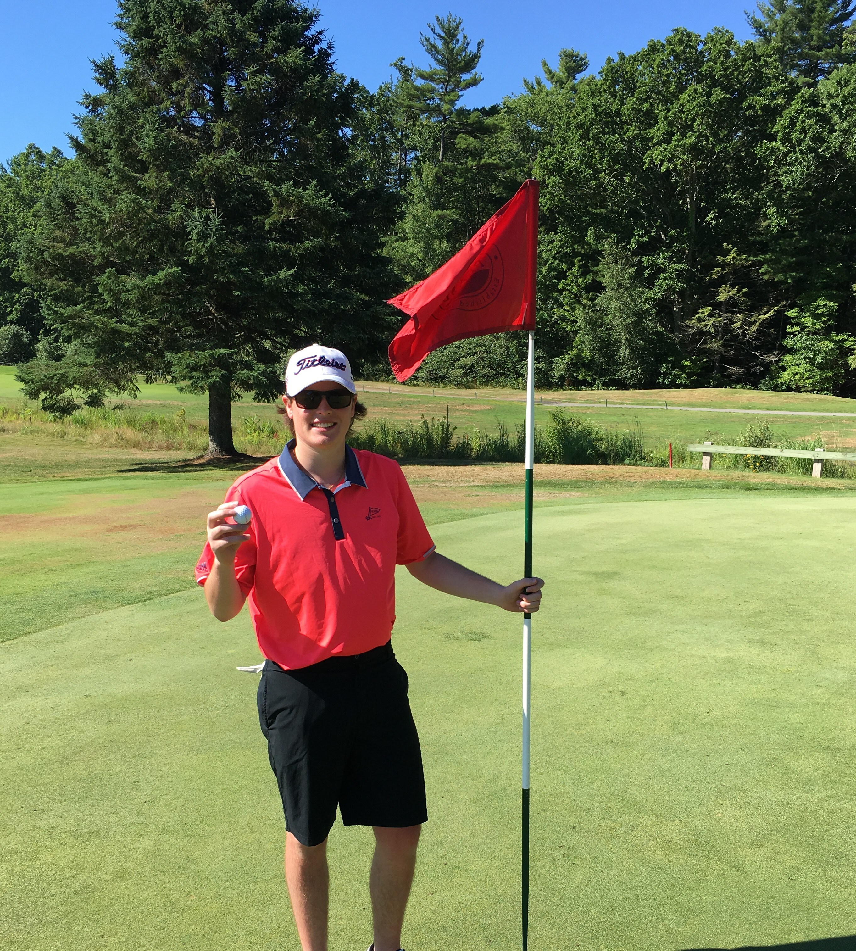 Pease Golf Course in Portsmouth NH, hole #8 is a Par 4, short but stil 265 yards, tees were up so we figured it was 234. Green is well protected by a hazard you must carry or decide to play it safe like my Dad and hit a 5 iron then chip on. I chose to go for it. Grabbed my 3 wood, as the jets took off around us my ball launched over the hazard and after a hop and roll the ball disappeared into the hole. Some folks never get to see a hole in one on a Par 3 let alone get one or even see one on a Par 4! Awesome golf day with my dad, uncle and cousin, a day we will always remember.