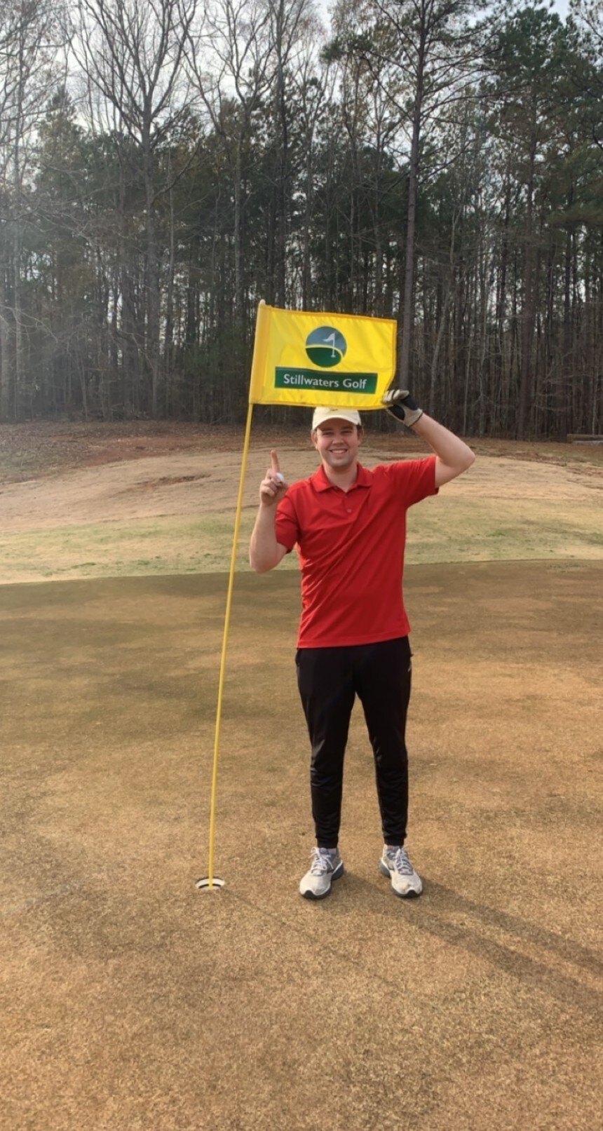 I was playing Kirkland golf balls and playing horribly, so I got the only sleeve of ProV1s that I had out for the Par 3 14th. I hit a cut into a right pin, and landed just short of the green. The ball took one big hop, rolled, and disappeared. My brother and I looked at each other and didn’t say anything because I had a similar shot on this hole before that was just hidden by a mound on the green. We took off in our carts and sprinted on to the green and celebrated when we saw it was in.
