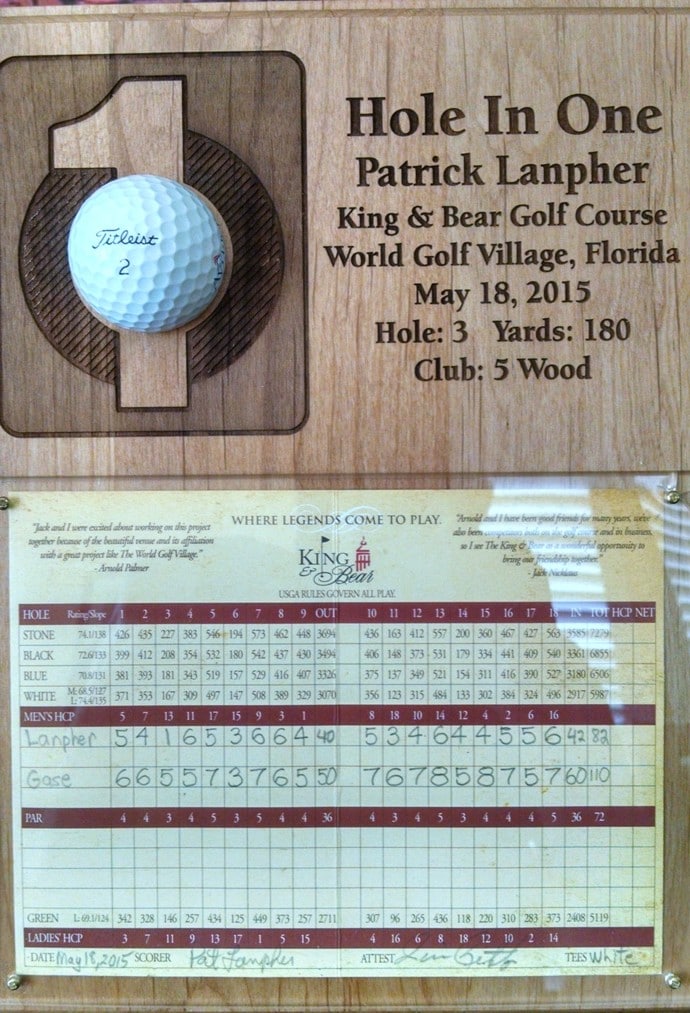 At 72 years of age, I didn't think I was "eligible" for a hole-in-one, but when we moved to the World Golf Village in Saint Augustine, FL, I met an 80 year old that had a lifetime total of 5 aces, including two at the King & Bear golf course here at the World Golf Village. And then, on May 18, 2015, it happened! A par 3 (hole 3) had the flag in the back of the green at 180 yards. I hit my ProV1 (number 2-now my favorite ProV1 number) with my 5 wood and watched the ball hit the green and thought it roled off the back. When we drove up there, I looked all over the rough over the green but couldn't find the ball. There was only ONE OTHER PLACE it could be. I cautiously peeked into the cup. There it was! After 7 years of retirement golf, I finally did it.