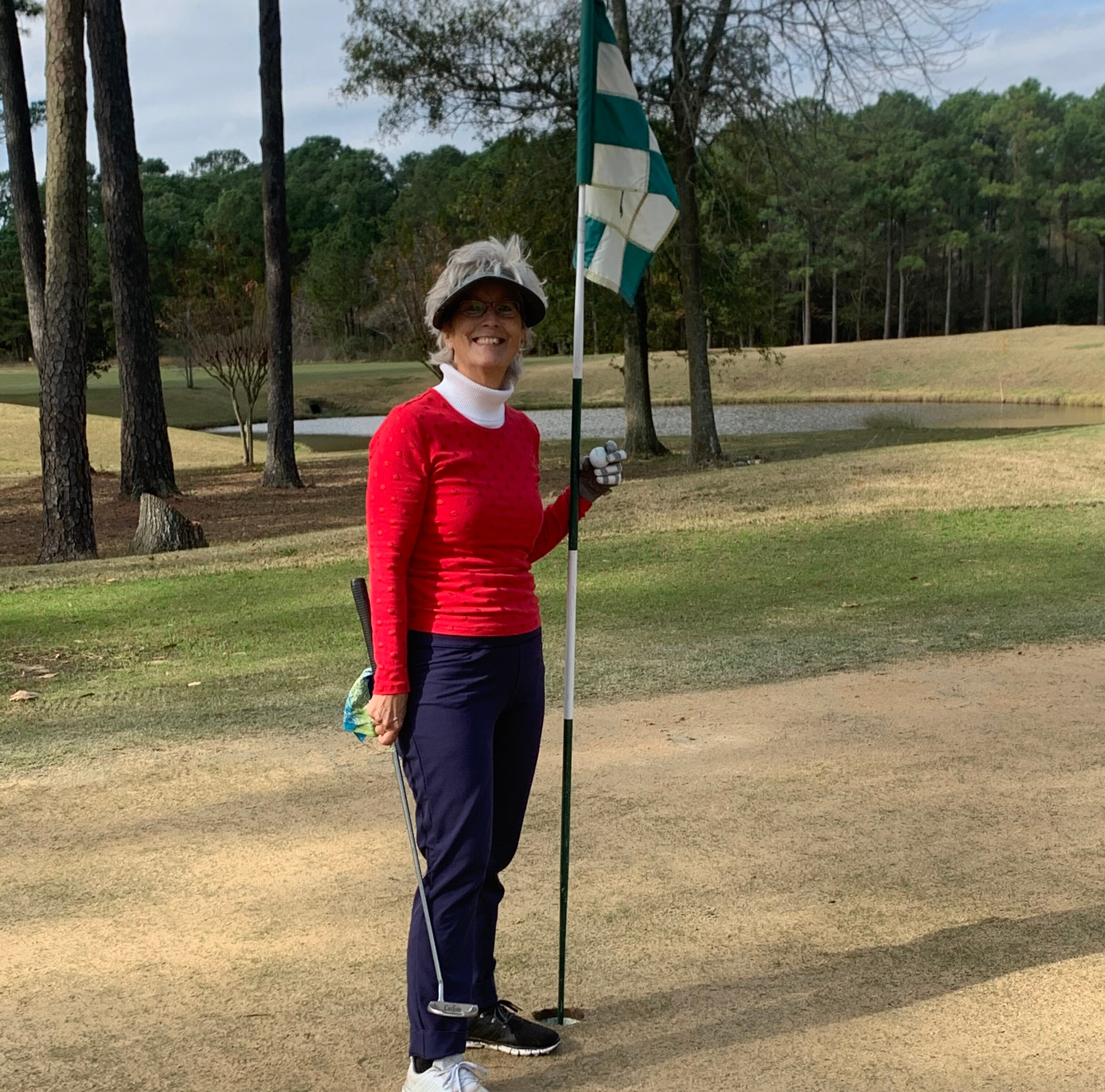My friend, Francine Hammer, and I were playing a two person scramble against Jennifer Dunaway and her sister, Cheryl Doyle. We do this often and Jennifer and Cheryl always beat us. On December 18, 2020 we started the day at Timber Creek Golf Course in Friendswood, Texas. The day promised to be cool (at 50 degrees) with wind picking up to 15 – 20 mph later in the morning and we were lucky the course was not cart path only but we still had pretty wet and muddy conditions. The day was proving to be unusual as Francine and I somehow were 3 strokes ahead of our competitors by the 6th hole. There was plenty of ribbing going on and Francine told me repeatedly we better get as many strokes ahead as we could before Jennifer and Cheryl started pouring on the gas.