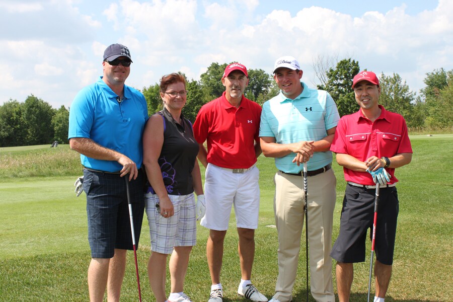 Time to play some golf! Our contest winners Mike and Michelle (left) tee it up first with Scott.