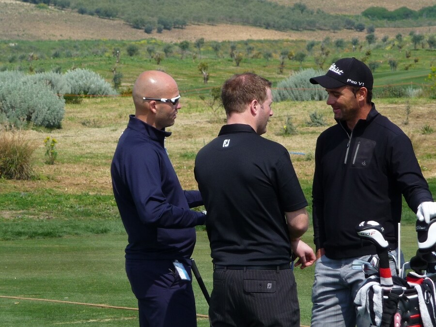 Tour technicians Phil "Lucky" Dimmock and Henry chat with Titleist ambassador Ricardo Santos