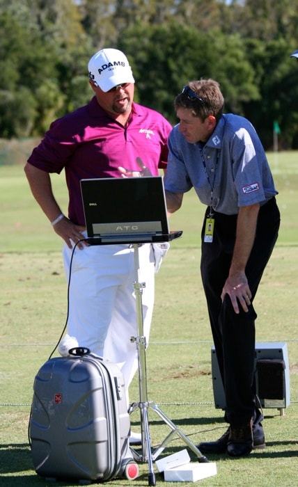 Pro V1x loyalist Kris Blanks tested out the new Titleist Pro V1x prototype golf ball Tuesday on the range with Titleist Tour Rep Fordie Pitts.