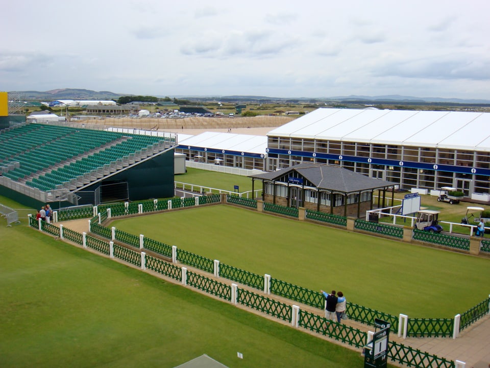 A rare look at the practice green, minus anyone practicing.