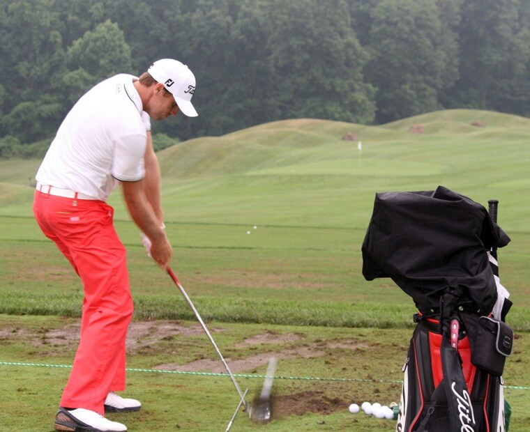 Titleist Brand Ambassador Nick Watney takes one of his first swings with the new Prototype AP2 irons on the range Tuesday at Aronimink.