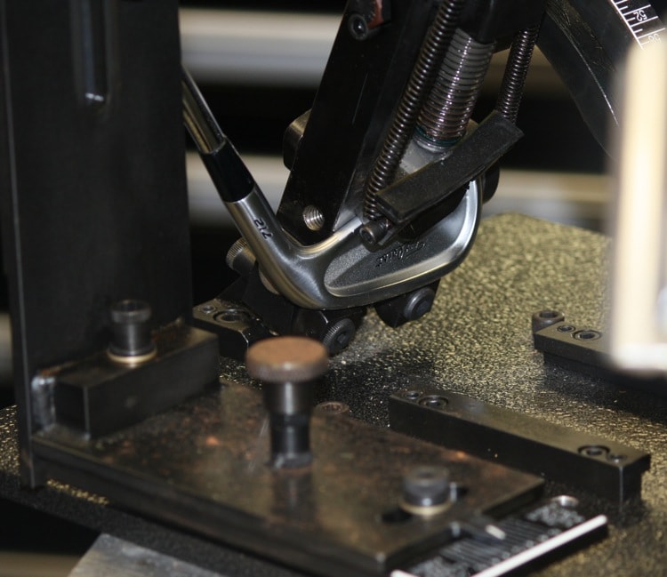 A new Prototype CB iron gets checked in the loft/lie machine inside the Titleist Tour Van.