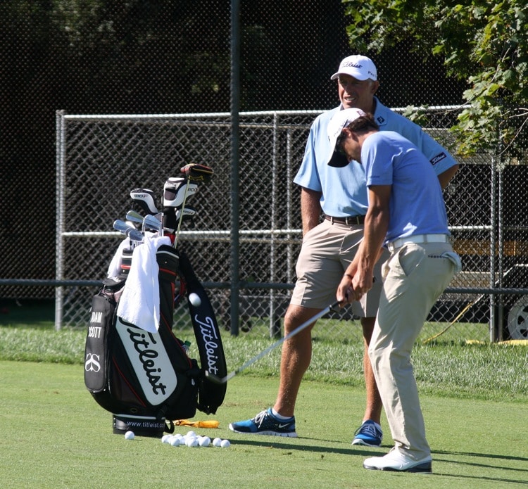 Short game is going to be key this week at The Barclays. Adam Scott gets his reps in before heading out to play a practice round.