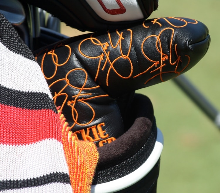 Protecting his prototype Scotty Cameron putter is this one-of-a-kind headcover.