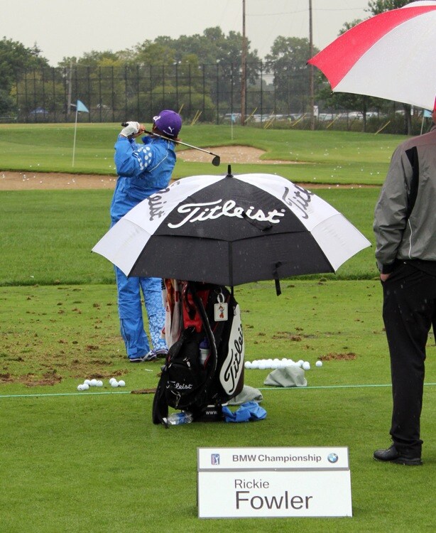 Passing rain shower. Don't worry, Titleist Brand Ambassador Rickie Fowler's clubs are staying dry.