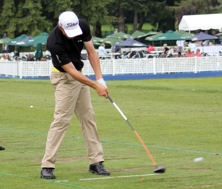 Morgan rips his Titleist Pro V1x golf ball down the middle of the range.