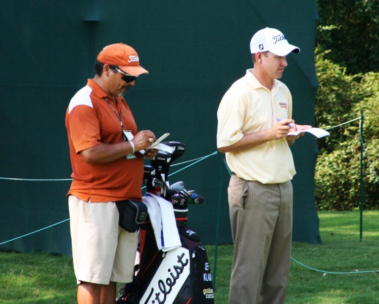Titleist Brand Ambassador Jeff Klauk and caddie get to some note-taking.