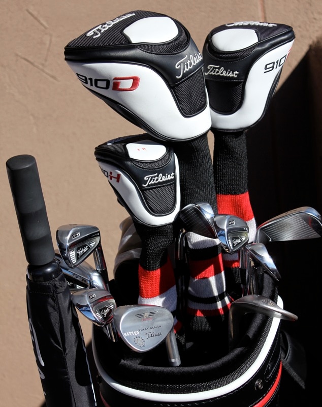 Matteo plays four Titleist 910 metal woods (only three of them are pictured): 910D2 9.5º driver (Project X Graphite Tour Issue 6A4) with the SureFit Tour hosel set at D•1; 910F 13.5º fairway metal (Project X Graphite Tour Issue 7A3) set at B•1; Titleist 909H 17º hybrid (Project X Graphite Tour Issue HC1); and 910H 21º hybrid (Project X Graphite Tour Issue HC1) set at A•1.