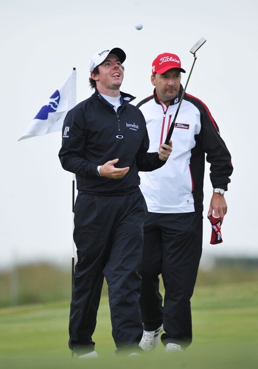 Titleist Brand Ambassador Rory McIlroy tosses his Pro V1x golf ball in the air while walking to the next tee during a practice round earlier this week. Also pictured: Rory's Scotty Cameron GSS Prototype in Chromatic Bronze finish and his new Tour Only British Championship Scotty Dog headcover (in his caddie's hand).