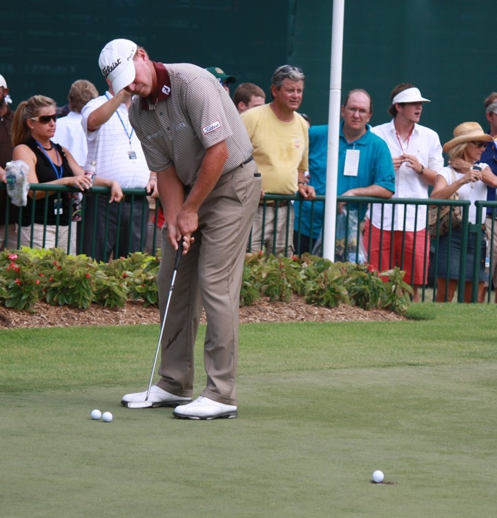 On the other side of the putting green, Titleist Brand Ambassador Steve Stricker rolls his Pro V1x.