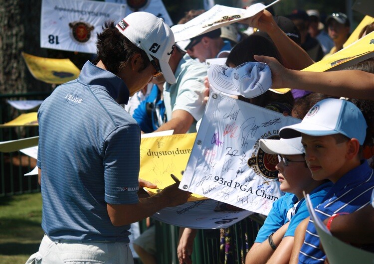 Titleist Brand Ambassador Kevin Na signs some autographs for fans hanging out near the putting green.