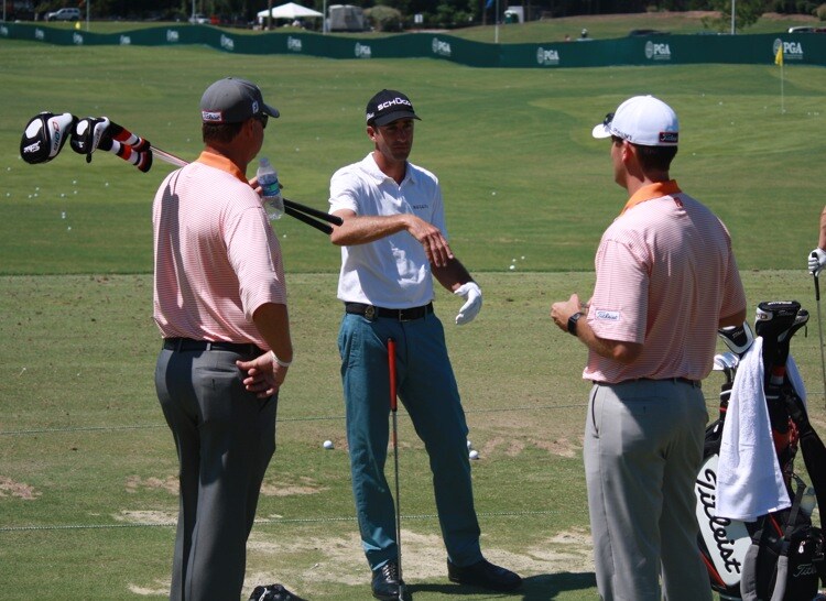 Titleist Tour Reps Scott Cuppett (left) and Kelly Moser check in with Titleist Brand Ambassador Geoff Ogilvy.