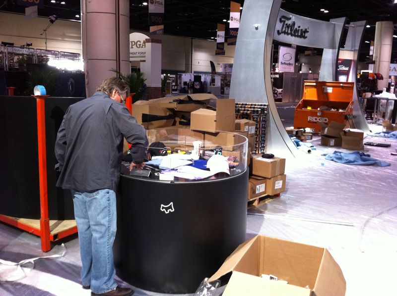 Scotty Cameron prepares one of the display cases in the Titleist booth.
