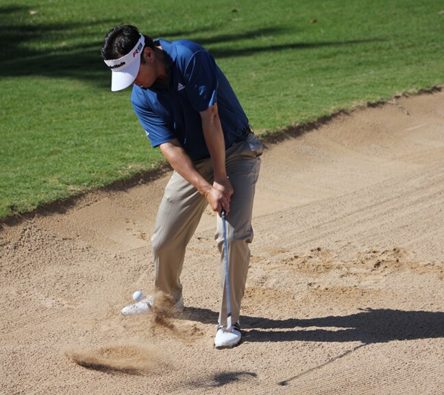 Pro V1 loyalist Charlie Wi hits out of a bunker during Monday's practice round.
