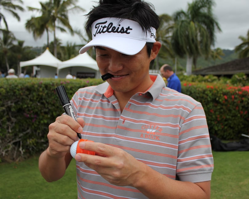 Titleist Brand Ambassador Ryuji Imada prepares for a putting drill by drawing a line around his Pro V1x golf ball.