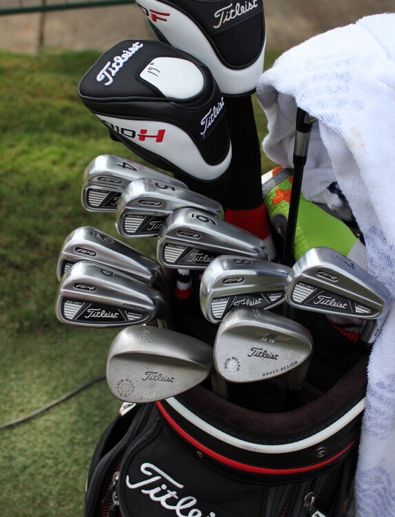 There's Jason's bag, full of Titleist 910 metal woods, prototype Titleist AP2 (712 Series) irons, Vokey Design Spin Milled wedges and a Scotty Cameron California Fastback.