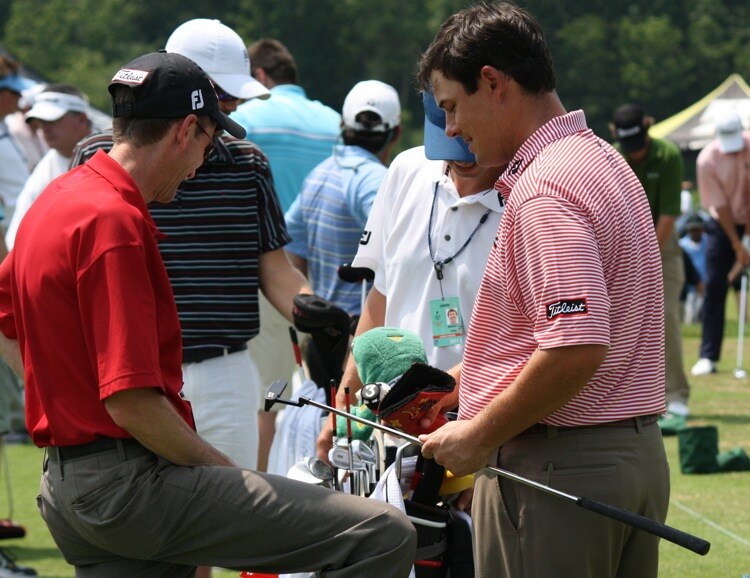 Titleist Brand Ambassador Johnson Wagner talks shop with Titleist Tour Rep Fordie Pitts.