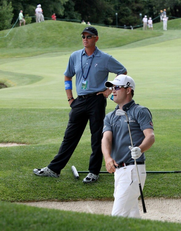 Dave Phillips of the Titleist Performance Institute looks on as Titleist Brand Ambassador Zach Johnson tests a new Vokey Design Spin Milled wedge to help with the heavy sand in Congressional's bunkers.