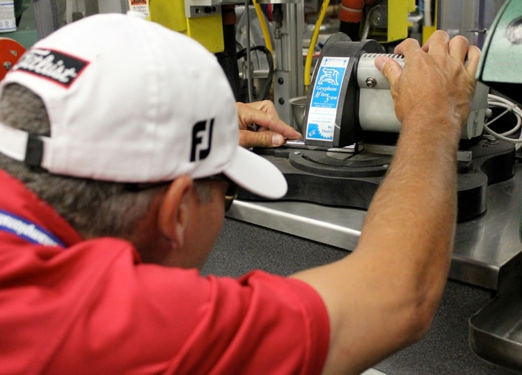 Inside the Titleist Tour Van, Scotty Cameron Tour Rep Larry Silveira trims the shaft for a new putter for Titleist Brand Ambassador Do-Hoon Kim.