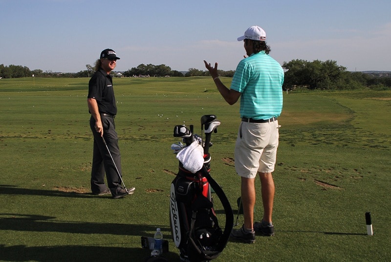 Titleist Brand Ambassdor Charley Hoffman has a laugh with his caddie on the range at TPC San Antonio.