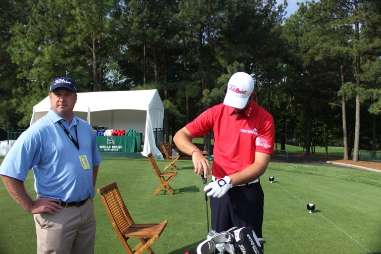 Titleist Brand Ambassador Bobby Gates adjusts the SureFit Tour hosel on his Titleist 910F 13.5º fairway wood while putting in some work with Titleist Tour Fitter Dino Antenucci.