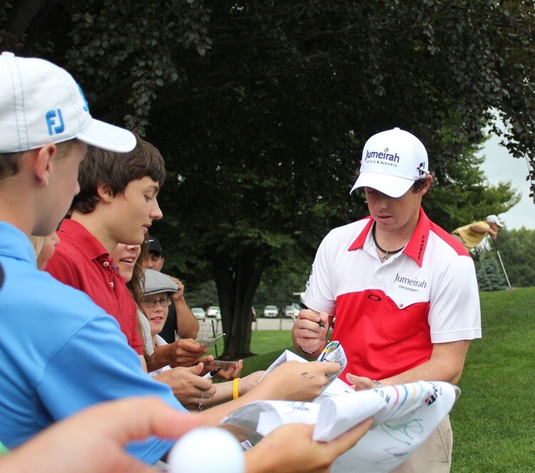 The U.S. Open Champion signs a few autographs on his way to the first tee for his practice round.