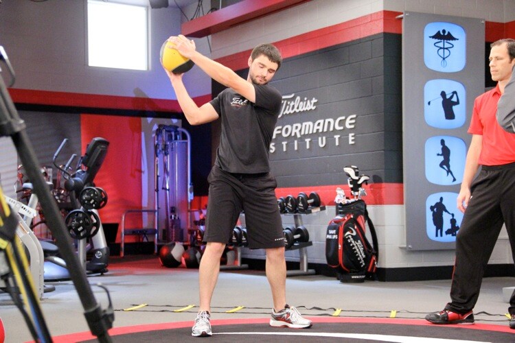 Titleist Brand Ambassador Kyle Stanley demonstrates medicine ball lifts.