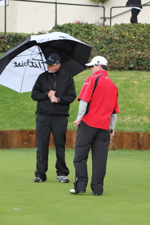 Titleist Brand Ambassador Zach Johnson rolls his Pro V1x in a light Los Angeles drizzle.