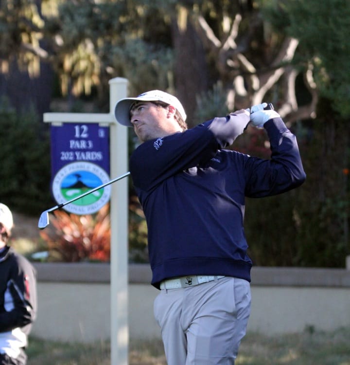 Titleist Brand Ambassador Will Claxton attacks the par-3 12th with one his new Titleist MB (712 Series) irons.