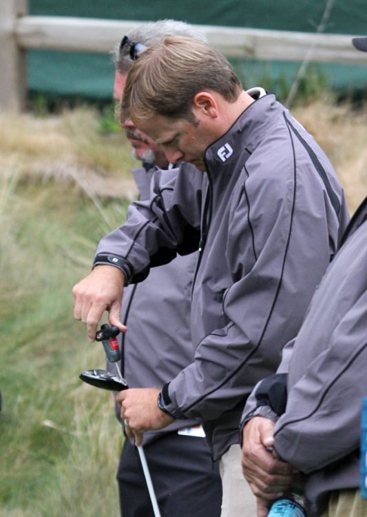 Titleist Tour Rep Chris Tuten makes a SureFit Tour hosel adjustment during a testing session with Titleist Brand Ambassador Bobby Gates.