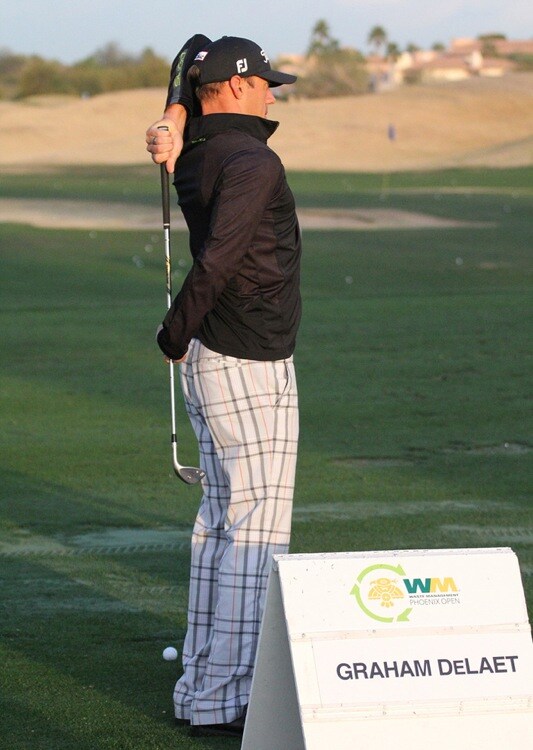 Graham DeLaet uses a new Vokey Design SM4 wedge to help stretch his back before a range session.