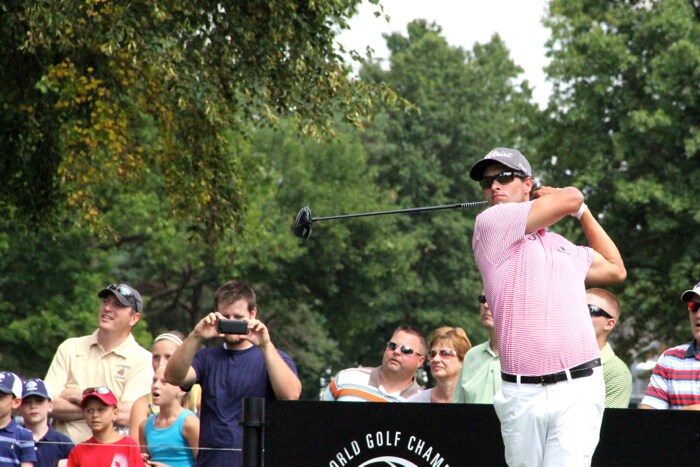 Defending champ, Titleist Brand Ambassador Adam Scott tees off on the 11th hole in a practice round.