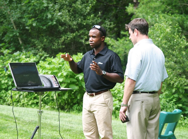 East Coast team member John explains the Titleist Performance Ball Fitting process to Wollaston Head PGA Professional Steve Mann.