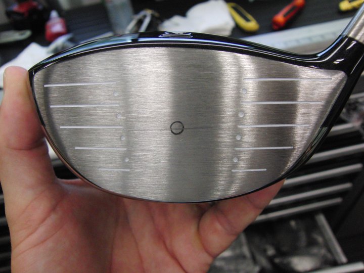 This 909 head just returned from a USGA's Coefficient Of Restitution test. The process leaves a little mark on the face, where the golf clubhead is impacted several times by a small steel pendulum. This test measures the flexibility of the golf clubhead. This 909 passed the test with flying colors, but a non-conforming clubhead is too flexible will produce too great a trampoline effect upon the ball.