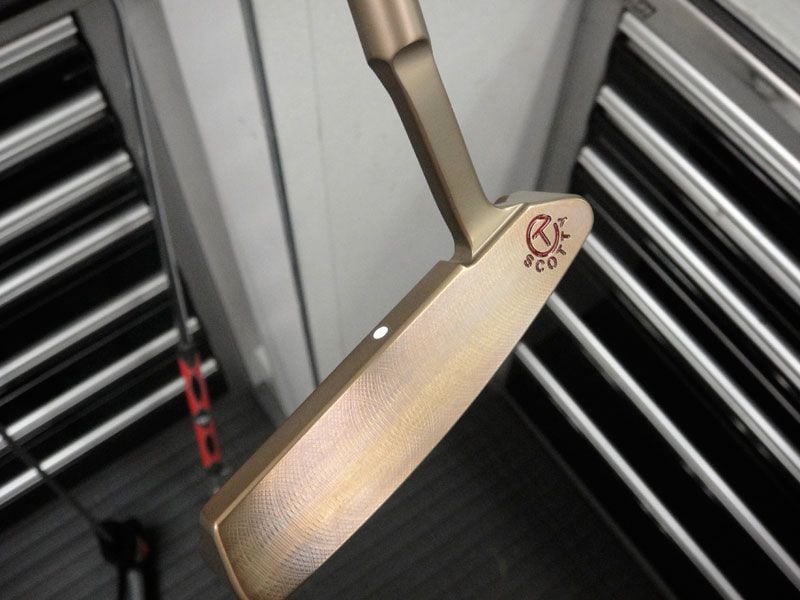 A great shot of the putter face showing the clean sight dot on the topline of the putter.