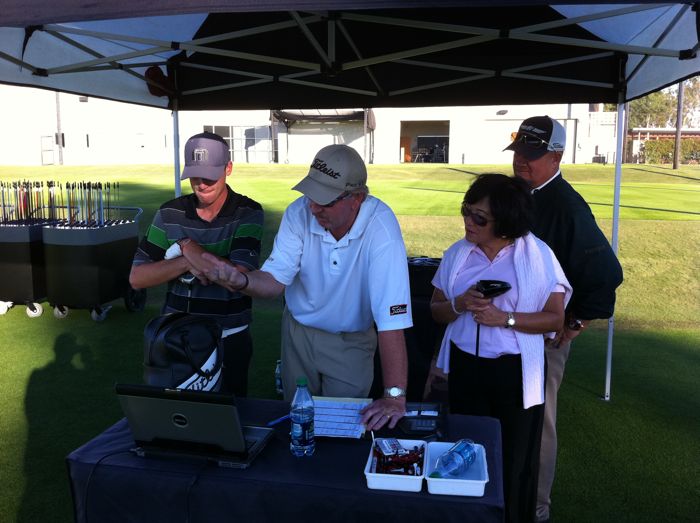 Senior Club Fitting Analyst Kurt Donahoo (middle) breaks down the numbers on the TrackMan launch monitor.